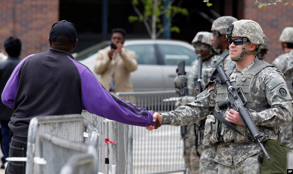 A man shakes hands with a National Guard soldier outside City Hall in Baltimore, Maryland. State's Attorney Marilyn J. Mosby announced criminal charges Friday, against all six officers suspended after Freddie Gray suffered a fatal spinal injury in police custody.